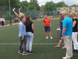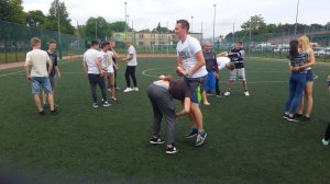Następnie Wojtek przeprowadził trening dla wszystkich chętnych. Ochotnicy pod okiem Wojtka solidnie ćwiczyli różne chwyty, niektórzy dobrze się przy tym bawiąc. W nagrodę za odwagę i chęć do ćwiczeń, nasz gość postanowił nagrodzić wszystkich 14 uczestników treningu (4 dziewczęta i 10 chłopców) zaproszeniem do bezpłatnego udziału w treningach w swojej szkole przez cały miesiąc czerwiec.