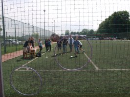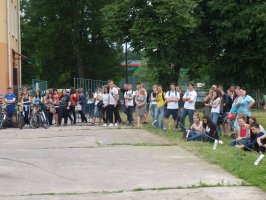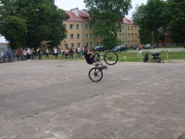 Następnie wszyscy uczestnicy imprezy udali się na szkolny parking. Tu na swój występ oczekiwali już kolejni goście specjalni, grupa LovelHard. Grupa wykonuje akrobacje motocyklowe i rowerowe, a w jej skład wchodzą: Jarosław Janik (czerwony motor Honda CBR 600 F4i sport), Paweł Pasierbowicz (czarny skuterek Yamaha Booste), Damian Kołodziejczyk (rower) i Mateusz Kołodziejczyk (czarny skuterek j.w.). Mateusz jest uczniem naszej szkoły, a jego ubiegłoroczne osiągnięcia to zajęcie, w różnych zawodach 4 razy drugiego i 1 raz trzeciego miejsca, co w klasyfikacji generalnej Mistrzostw Polski dało mu trzecie miejsce. W tym roku członkowie grupy zamierzają startować w Mistrzostwach Polski, Czech Republic Stunt Day i Mistrzostwach Europy w Bydgoszczy. W ich wykonaniu obejrzeliśmy ciekawe pokazy akrobacji motocyklowych i rowerowych. Pomimo trudnych warunków w postaci pewnego niedostatku powierzchni parkingu oraz stanu jego nawierzchni, wykonywane ewolucje budziły podziw i uznanie widzów.