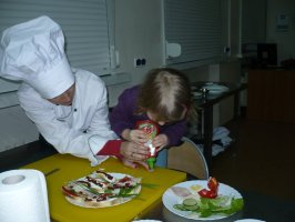 Mali goście pod okiem rodziców, wspierani fachowo przez uczniów klasy drugiej technikum żywienia i gospodarstwa domowego, przyrządzili bogato zdobione kruche ciasteczka i fantazyjne kanapki. W prezentacji multimedialnej zaprezentowaliśmy im ciekawe wzory ciasteczek i kanapek. Dodatkową atrakcją dla maluchów była możliwość podziwiania i przymierzania „kucharskich” strojów. Przygotowane specjały degustowano przy odświętnie nakrytym stole. Na zakończenie każdy zespół rodzinny otrzymał pamiątkowy dyplom. Naszym najmłodszym „kucharzom” życzymy wielu kulinarnych sukcesów!