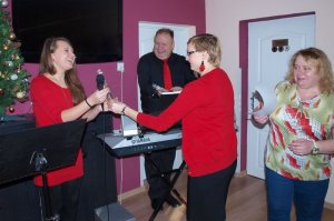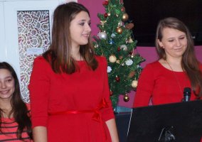 I rozpoczął się krótki recital, podczas którego uczennice z 2Th złożyły piękne życzenia podopiecznym i pracownikom oraz wręczyły wcześniej przygotowane kartki, a potem uczennice z 2Tl Anita i Patrycja oraz Pan Janusz tato Anity (dziękujemy za jego nieocenioną pomoc i poświęcony czas) zagrali i zaśpiewali w autorskich aranżacjach kolędy: Przybieżeli do Betlejem, Pospieszcie o wierni, W żłobie leży, a na bis Pieśń Hosanna.