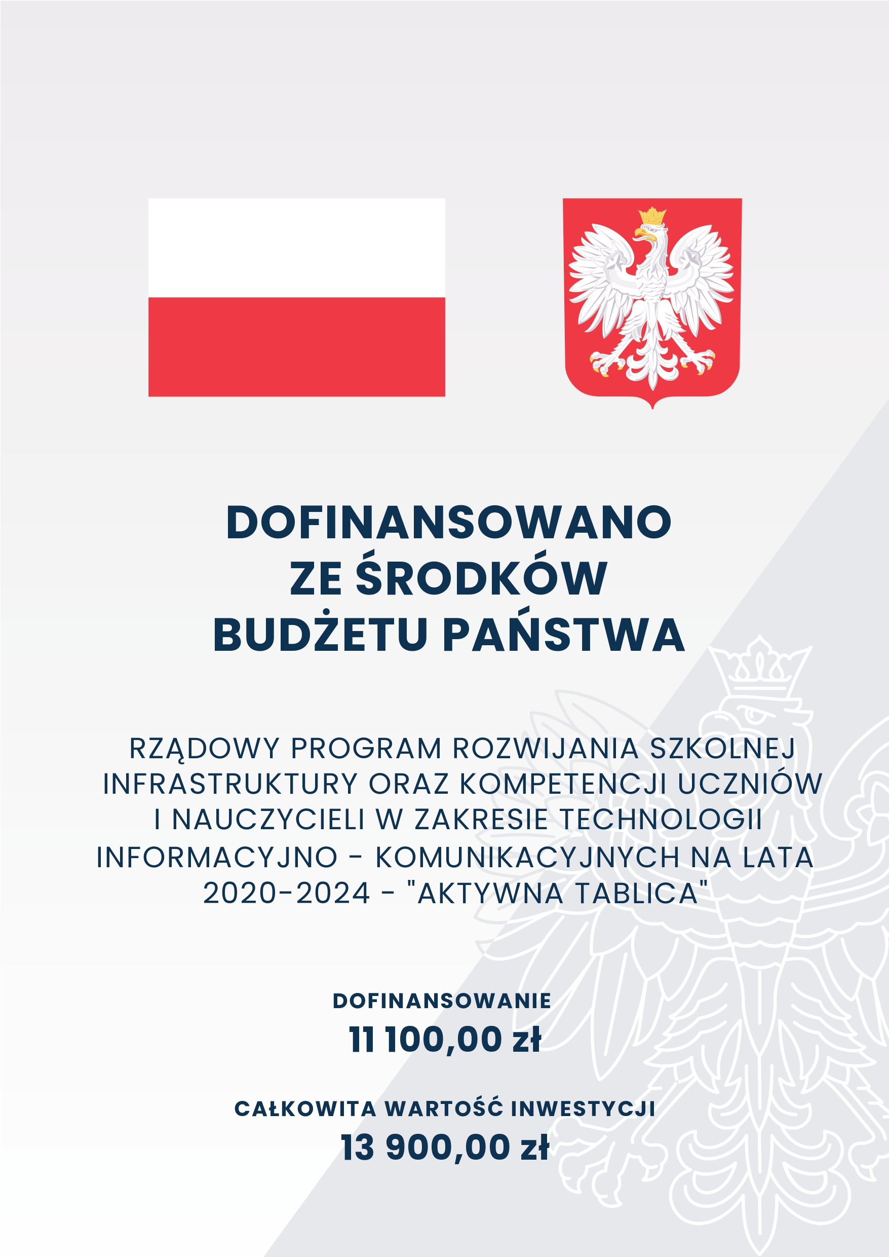 Nasza szkoła bierze udział w rządowym programie rozwijania szkolnej infrastruktury oraz kompetencji uczniów i nauczycieli w zakresie technologii informacyjno-komunikacyjnych "Aktywna Tablica 2024" .