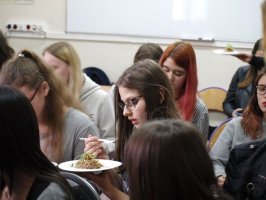 W wydarzeniu udział wzięli Pan Paweł Chudy - Wiceprezes Zarządu Syntea S.A., Pan Paweł Karczmarzyk - Project Manager, Pan Marcin Bożek - szef kuchni oraz Pan Kamil Kalita - specjalista ds. programowania i obsługi druku 3D. W części oficjalnej spotkania uczniowie wysłuchali krótkiej prezentacji dotyczącej proponowanej oferty szkoleń oraz zamierzonej certyfikacji. Następnie, już w mniejszych grupach, młodzież miała możliwość obserwowania pracy Pana Marcina, który – przy współpracy z uczniami naszej szkoły, przyrządzał pyszny obiad. Każdy z uczestników spotkania mógł spróbować wyśmienitej polędwiczki wieprzowej podanej z kaszą pęczak i sosem śliwkowym. Pan Kamil natomiast prezentował zasady funkcjonowania drukarki 3D oraz przykładowe elementy takiego wydruku. Opowiadał również o nietypowych rzeczach, które udało się wydrukować za pomocą takich właśnie drukarek.